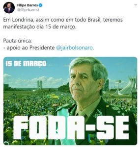Mas o gado não quer nem saber, está tentando empurrar esse manifestação convocada para o dia 15 de março. Sabemos que o Bolsonarismo já perdeu mais de 70% em apoio e logística que tinha antes, como o de grandes youtubers como Nando Moura e Diego Rox, o apoio de deputados midiáticos como Alexandre Frota e Joice Hasselmann, do próprio ex partido PSL, dos Governadores e etc.