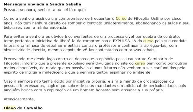 Diante da desistência de uma aluna antes dos cinco anos, Olavo ameaçou processá-la, vejamos o que ele escreveu para a referida aluna: